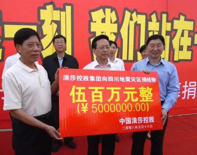 2008年5月16日,陈昌智主席接受会员企业浪莎控股集团向四川地震灾区捐款500万元。