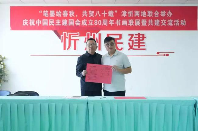 民建天津市直属工委第十支部与民建山西忻州第十八支部签署共建友好支部倡议书。50余件来自天津与忻州的书画作品在忻州市民建大讲堂展出,两地书画家进行了现场笔会与书画捐赠活动。