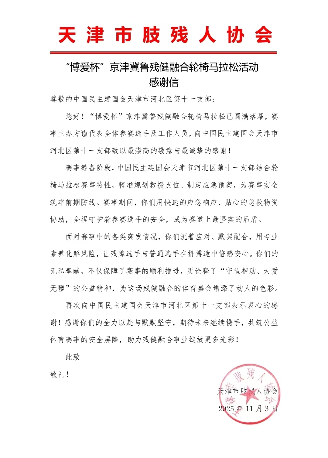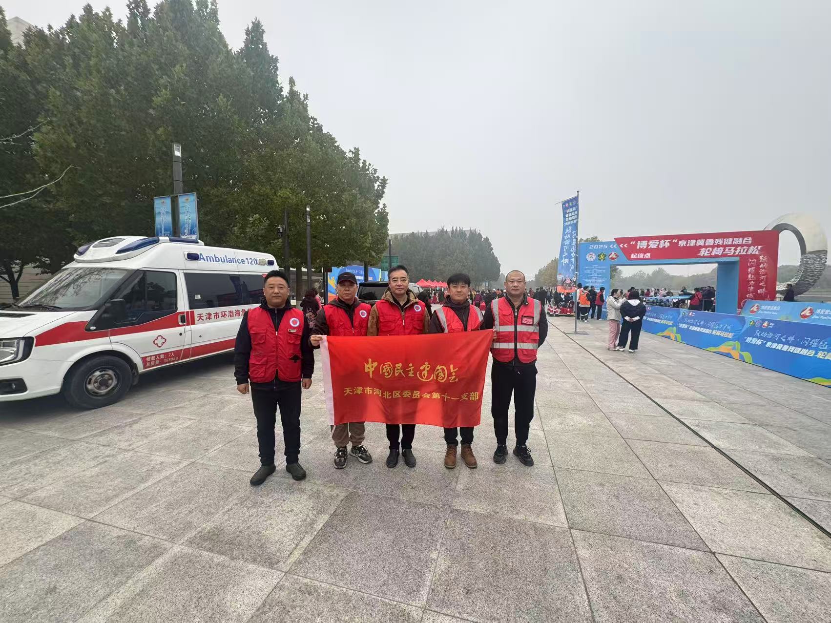 10月29日,河北区委会第十一支部组织志愿者队伍,积极参与在天津市文化中心举办的“跃动海河之畔·闪耀魅力津城——‘博爱杯’京津冀鲁残健融合轮椅马拉松”志愿服务活动。第十一支部主委陈伟带队,多名支部会员志愿者全程投身服务,与来自京津冀鲁四地的参赛运动员、其他协办单位工作人员及志愿者共同保障活动顺利开展。