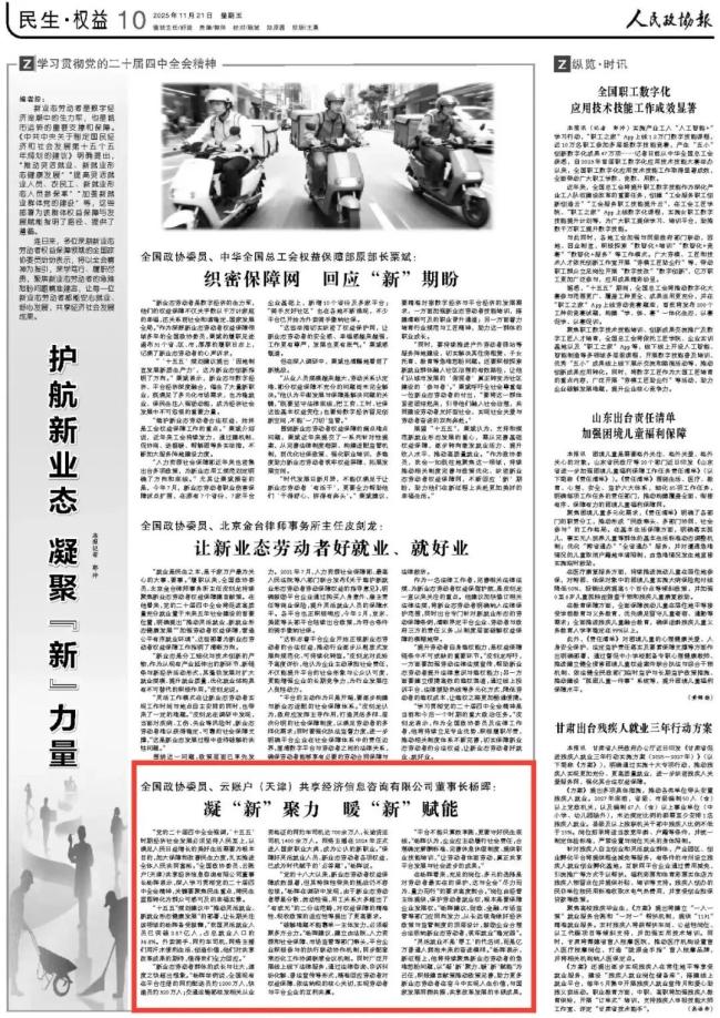 “党的二十届四中全会强调,‘十五五’时期经济社会发展必须坚持人民至上,以满足人民日益增长的美好生活需要为根本目的,加大保障和改善民生力度,扎实推进全体人民共同富裕。”全国政协委员,民建天津市委会常委、企业委员会主任,云账户(天津)共享经济信息咨询有限公司董事长杨晖表示,深入学习贯彻党的二十届四中全会精神,关键要聚焦民生重点,将民生蓝图转化为群众可感可及的幸福实景。“十五五”规划建议中“推动灵活就业、新就业形态健康发展”的部署,让长期关注该领域的杨晖备受鼓舞,“我国灵活就业人员已突破2.87亿人,占总就业人口的36.8%。外卖骑手、网约车司机、网络主播们用汗水便利生活、创造价值,他们对共享改革成果的期待,值得我们全力回应。”