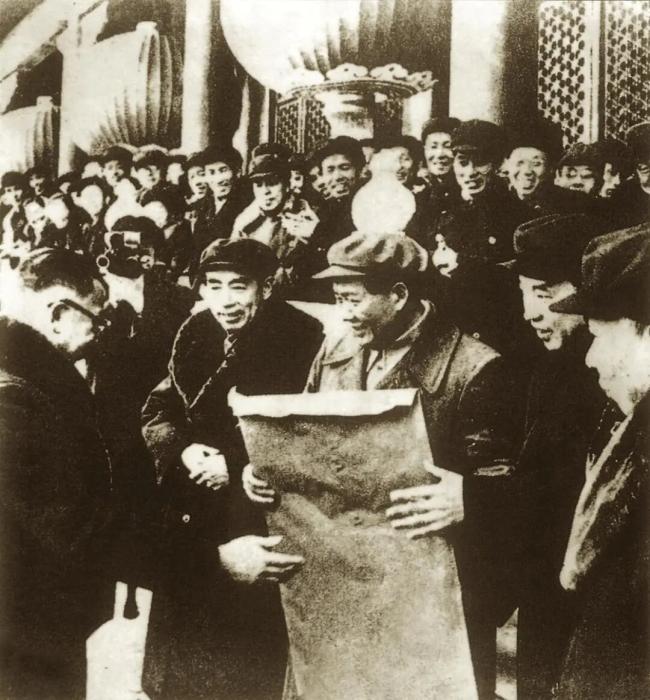 1956年1月15日,民建中央常委乐松生代表北京工商界在天安门城楼向毛泽东主席递送报喜信。