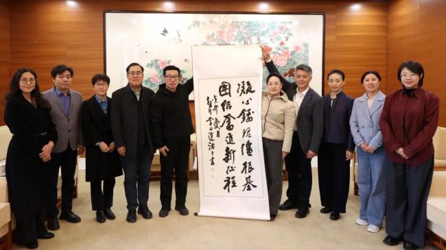 民建市委会向天津工业大学赠送书画院副院长李延达撰写的书法作品及《大道同心:中国民主建国会八十年光辉历程》图册。
