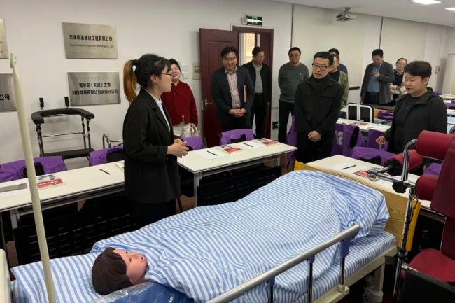 会前,市委会企业委员会秘书长、万事佳禾(天津)职业培训学校校长孙小颖带领与会人员参观调研学校,观摩了医疗陪护、失能老人护理的现场教学。