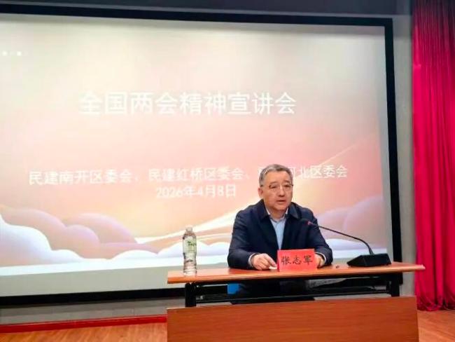 4月8日,河北区委会、南开区委会、红桥区委会联合召开全国两会精神宣讲报告会。全国政协委员、市委会副主委张志军出席并作专题宣讲。宣讲会由南开区委会主委李金胜主持,河北、南开、红桥区委会班子成员,区委委员及支部骨干会员共60余人参加学习。
